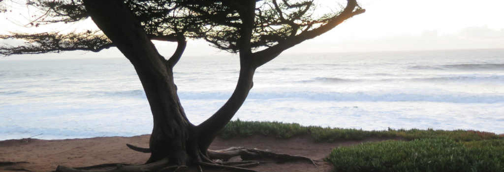 A secluded beach with golden bluffs, little birds running along the shore, a surfer or two, and forest behind.